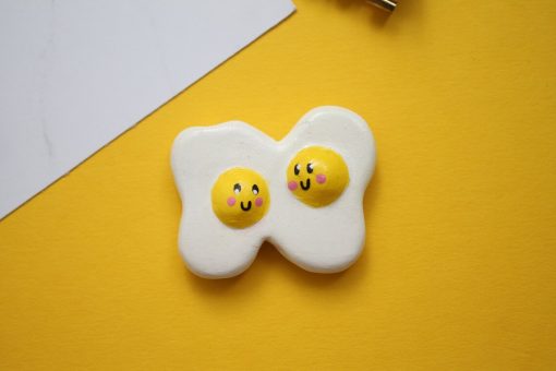 A small fried egg magnet made of clay. Handmade and painted with lots of love. It is perfect as a decoration or small gift!